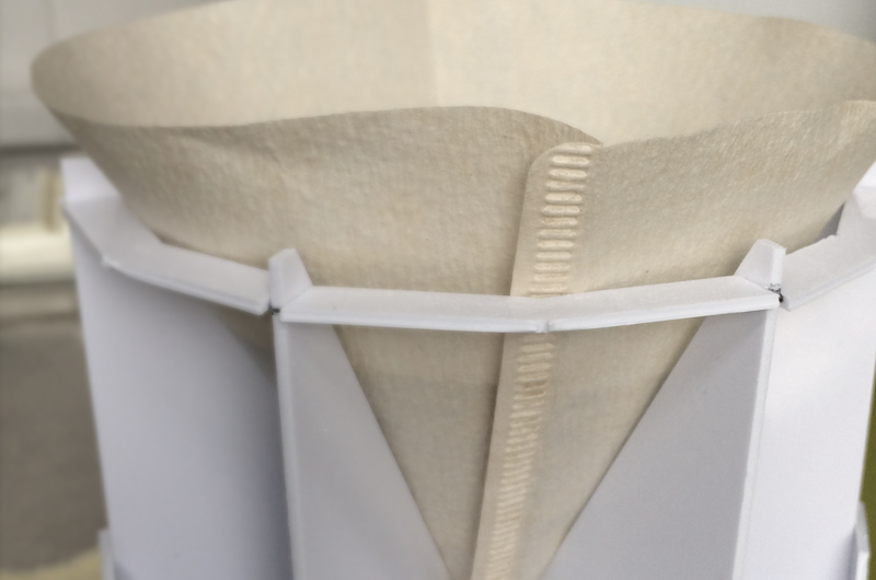 そこで出した結論は、「ペーパーフィルターとドリッパーの接点を出来るだけ少なくして、接する部分は垂直方向だけの器具を考える。」というものでした。