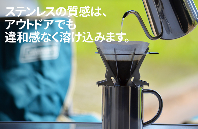 美味しいコーヒーをキャンプなどのアウトドアシーンでも愉しみたい!そんなコダワリ派にもおすすめです。分解や折畳みは出来ませんが、1~2杯用のコンパクトサイズ(約W101×D116×H77 mm)ですから持ち運びに大きなスペースは必要としません。適度な重量(約135g)は多少の風でもマグカップに載せた時の安定感に変わりはありません。(ペーパーフィルターだけが風で飛んでしまうので、早めにコーヒー粉を入れてくださいね!)