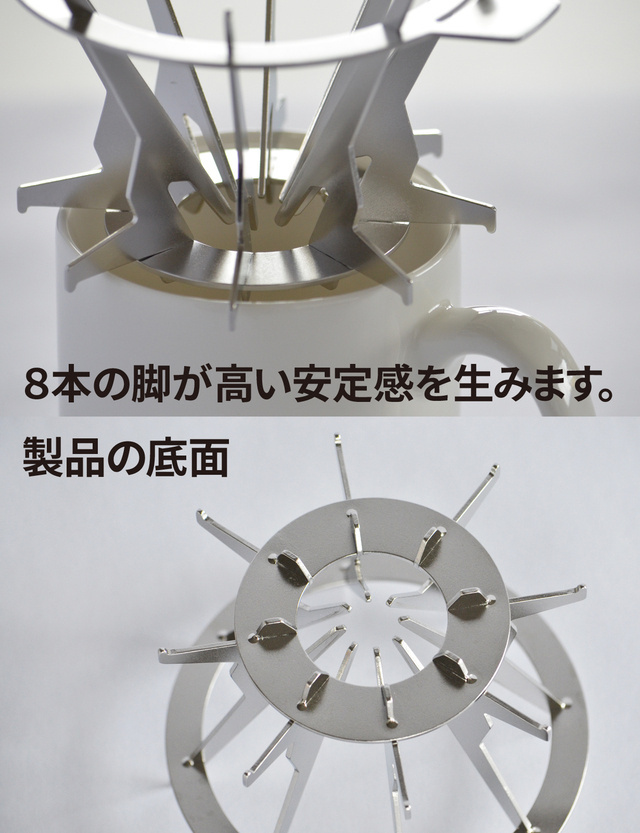 お気に入りのマグカップにOTMバートドリッパーSを載せます。そのとき、OTMバートドリッパーSの脚は8本!この脚が様々なマグカップやコーヒーサーバーの上に載せた時に高い安定感を生みます。ドリッパーが安定するからドリップもやりやすくなります。