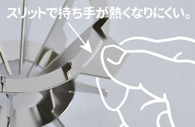 OTMバートドリッパーSは金属製(18-8ステンレス製)なのでガラスや陶器や樹脂と比べると熱伝導がよく、ドリップしていると、そのお湯で本体がだんだんと熱くなっていきます。そこで、ドリップの最中やドリップ直後に持ち手を掴んでも、過度な熱さを感じさせないように、スリットを設けて持ち手への熱伝導をある程度遮断し、持ち手が熱くなり過ぎない設計を施しました。
