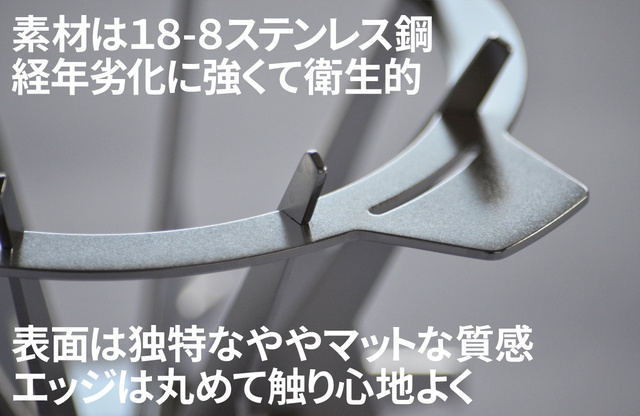陶器やガラスのように割れたり欠けたりもせず、プラスチックよりも熱に強いので、どんなにコーヒーを淹れる頻度が高くても買い換えることはないかもしれません。表面の仕上げは当社オリジナルのややマットな質感です。1.5mm厚のステンレス板の切断面はよく研磨し、痛くないようにエッジが丸められて触り心地を良くしました。