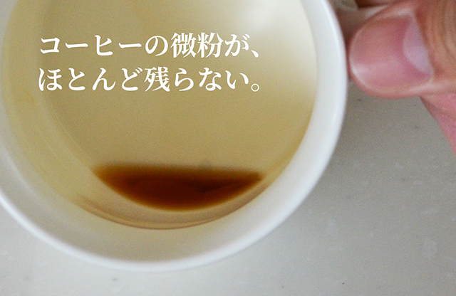 出来上がりのコーヒーに混ざる「微粉」を限りなく少なくできるので、金属製フィルターで淹れると感じることのある、口に入れた時の粉がザラつく舌触りをほとんど感じません。