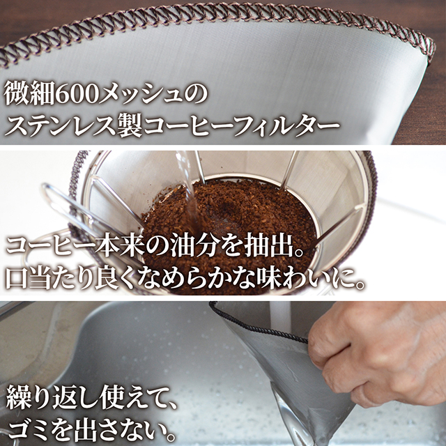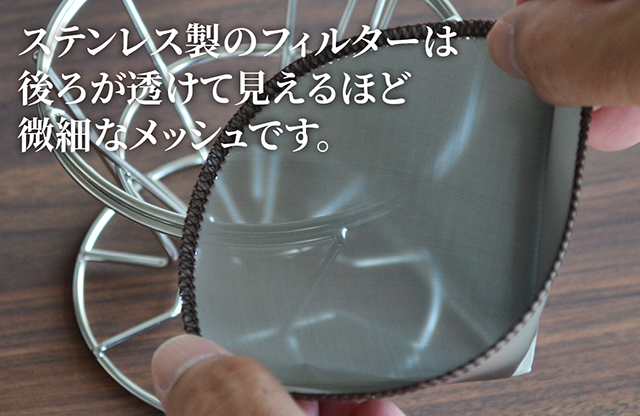 ステンレス製の微細メッシュフィルターが、いつものコーヒーを、口当たりよくなめらかな味わいにします。