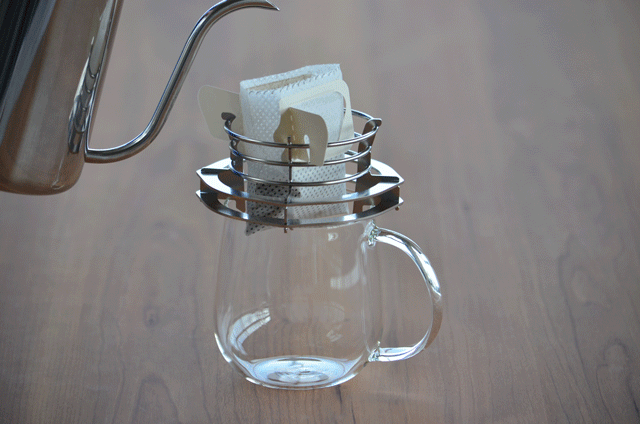 そこで冒頭の「気になりませんか?」ですが、カフェやおうちでペーパードリップ(透過式)に馴染んでいると、「抽出中にカップの中でコーヒーに浸っているドリップバッグ」って、やっぱり気になると思うんです。フレンチプレスのような金属フィルターと違ってバッグが紙製ですから豆の成分をすべて抽出・・・とは言えないかもしれませんし、ちょっとお高いドリップバッグコーヒーには、ドリッパーのようにカップの上に載せるタイプもありますから・・・。