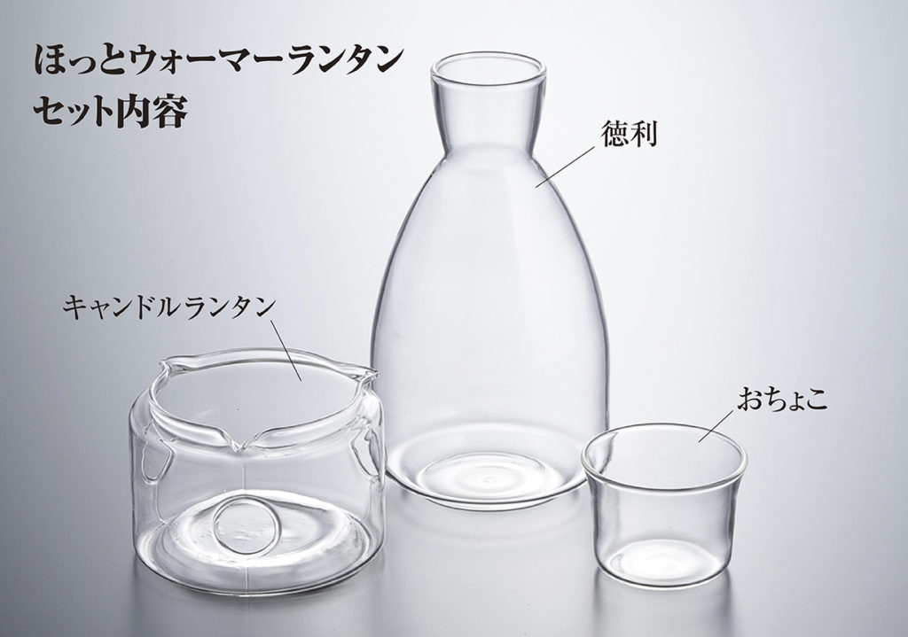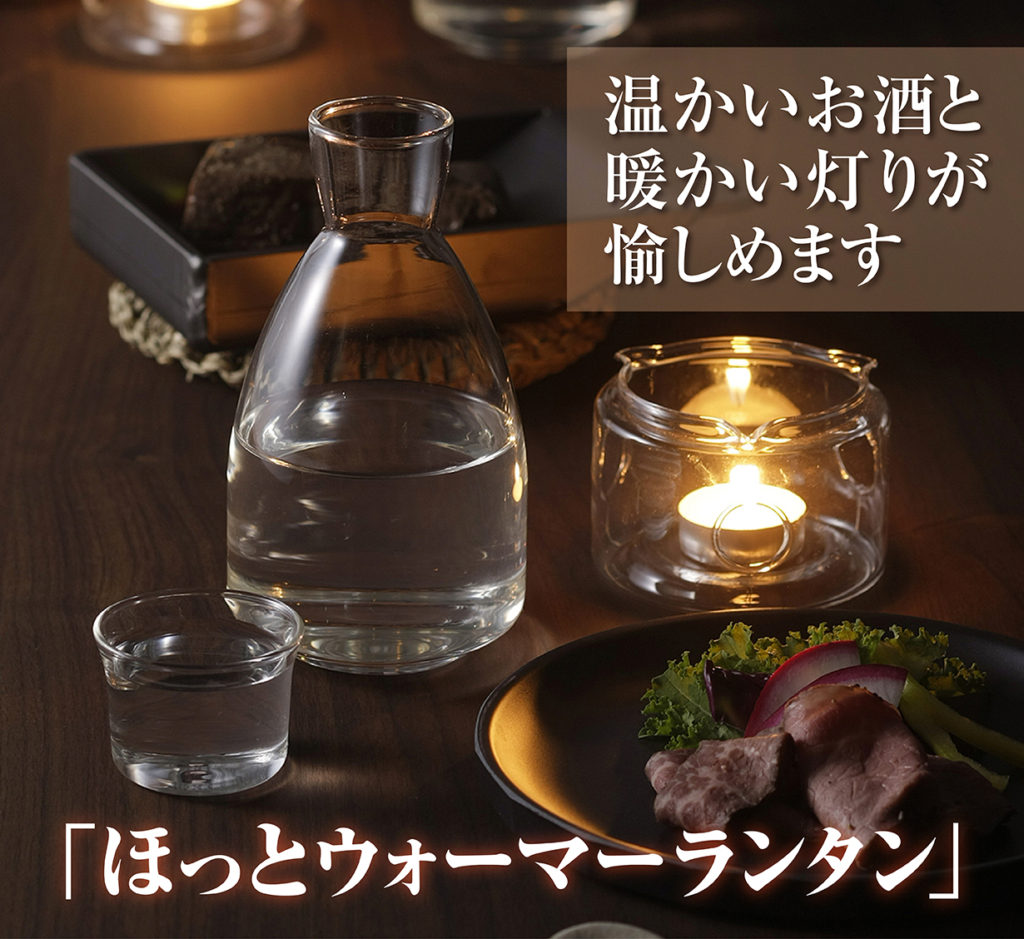 「ほっとウォーマーランタン」はキャンドルランタン&徳利&おちょこのセットで、ティーライトキャンドルの揺らめく灯(あか)りを見つめながら、熱燗(あつかん)やぬる燗(かん)等の温かいお酒を味わい愉しむことが出来るアイテムです。(全て耐熱ガラス製です。)