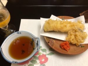 【天麩羅】鱧の天麩羅です。鱧は関西圏で馴染み深いお魚ですが関東圏ではあまり目にしません。独特の旨みがありますが小骨が多く卓越した技術がないと調理もできません。サクサクのころもで揚げ方も絶妙で美味でございます。