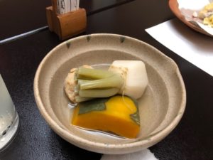 【煮物】この煮物は上品な御出汁で炊き上げられておりお野菜の本来の美味しさが引き立ちます。鱧のつみれからも上品な御出汁がでており、お家ではマネができないプロの味です。